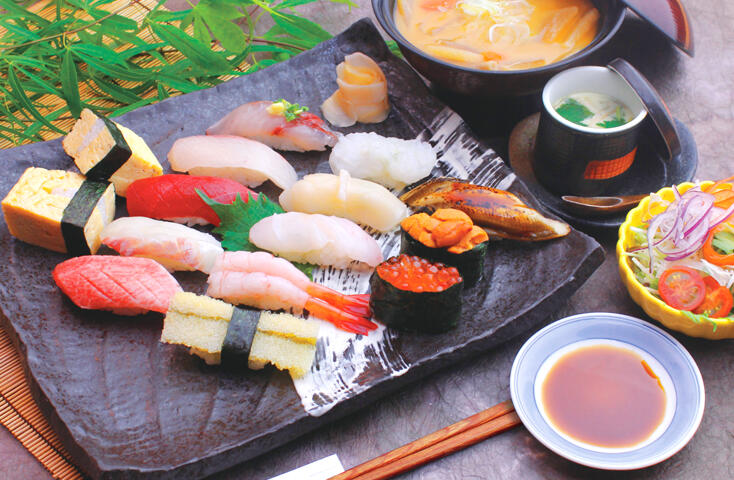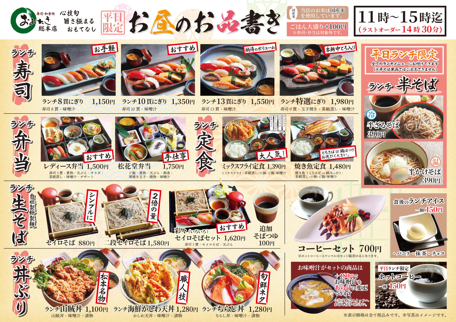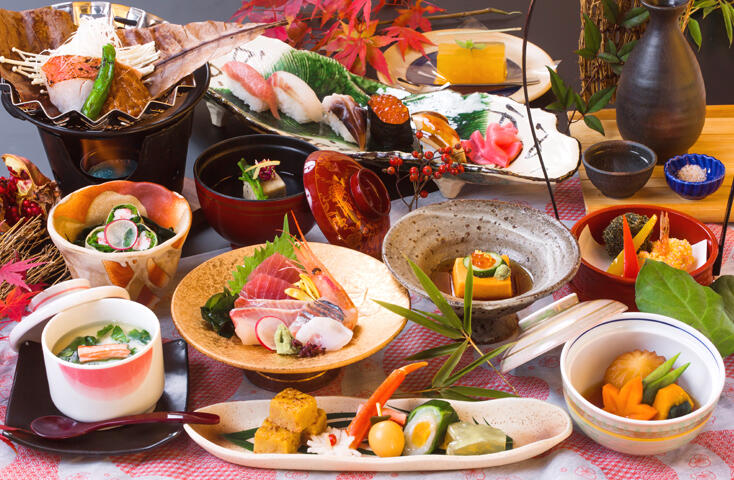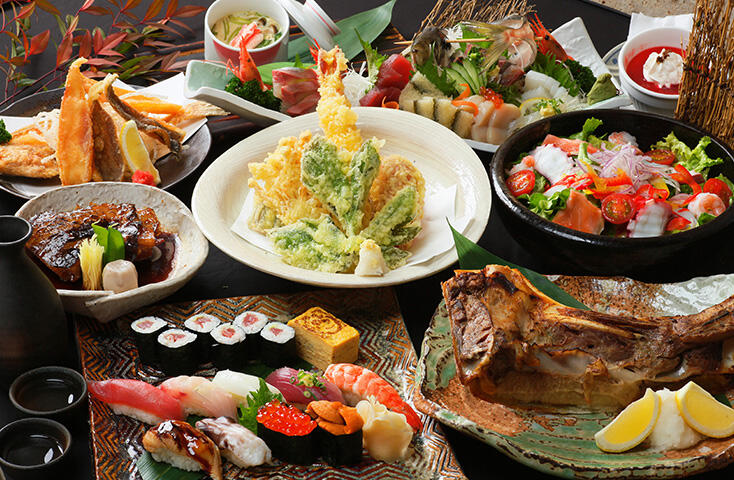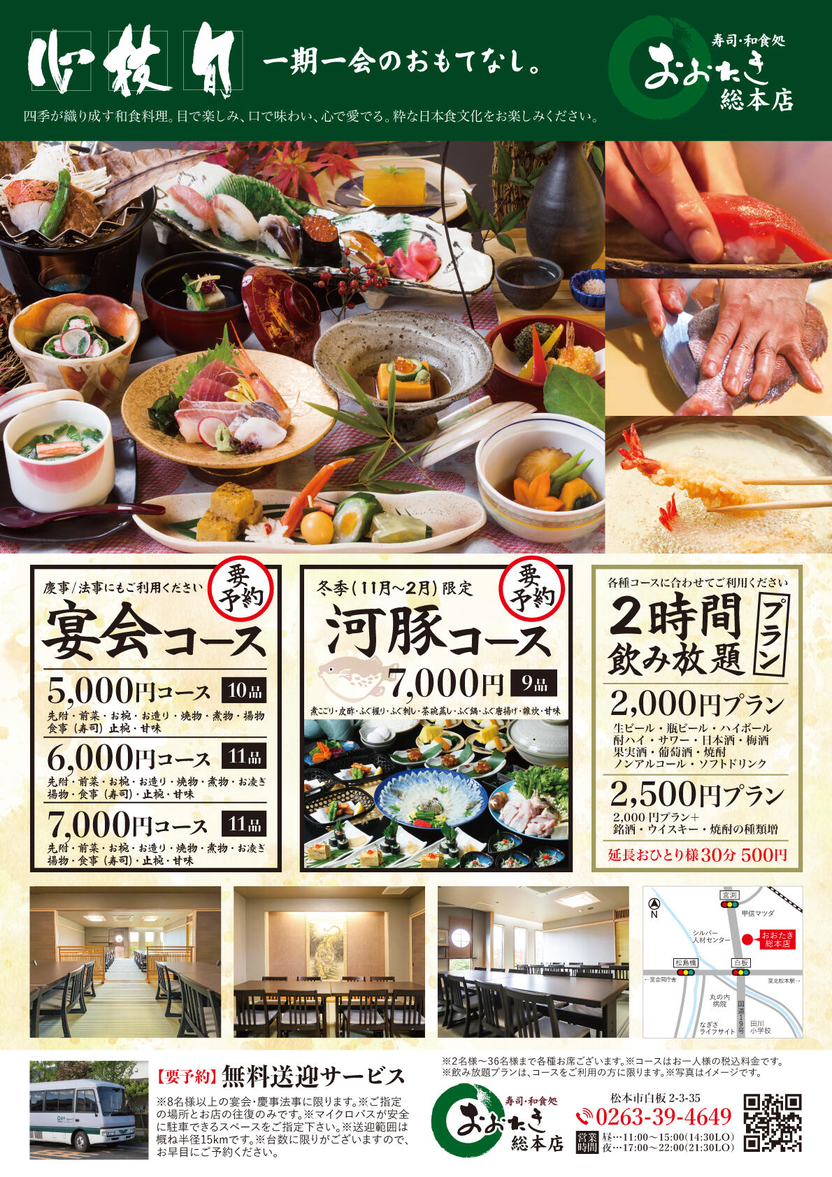おおたき総本店は40名・20名収容の宴会場を備えた大型店。ゆったり過ごせる半個室や本格寿司を味わえるカウンター席に加え、膳料理、丼、そばセット、ひつまぶしなど多彩なスタイルの食事をご用意しています。三世代のご家族や会社のご接待・忘新年会、女子会にも最適です。8名様以上のコース予約で無料送迎バスも承ります。