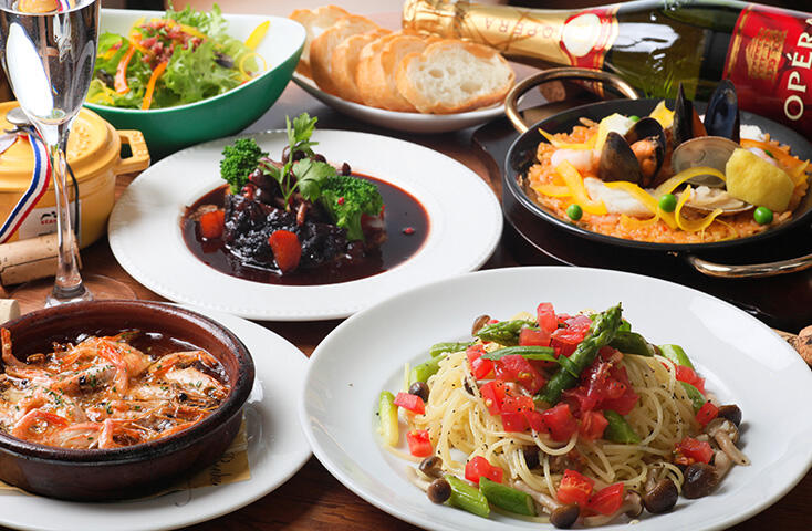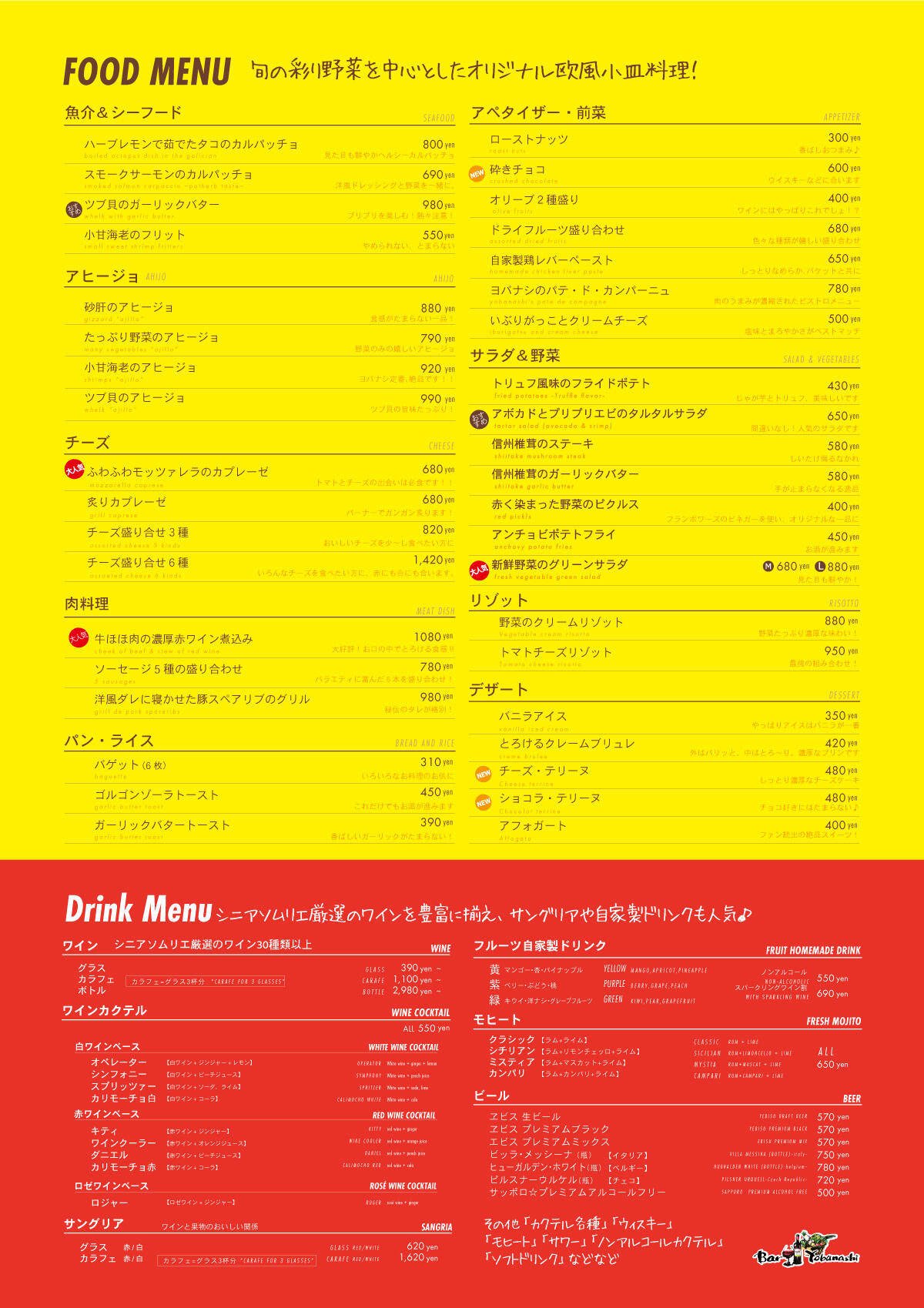 彩り野菜の欧風小皿料理とカジュアルワインバル。気軽に楽しめるワイン&欧風バル。グラスワイン20種、ボトルワイン30種類と豊富なラインナップ、お気に入りの味を探せる場所です。