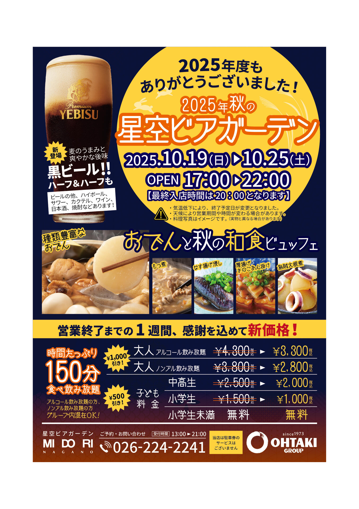 「秋のビアガーデン」絶賛開催中!今年は10月25日(土)まで! 営業終了までの1週間は、2025年の感謝を込めて更にお得な価格で提供します。 今年最後のビアガーデンに是非お越しください。