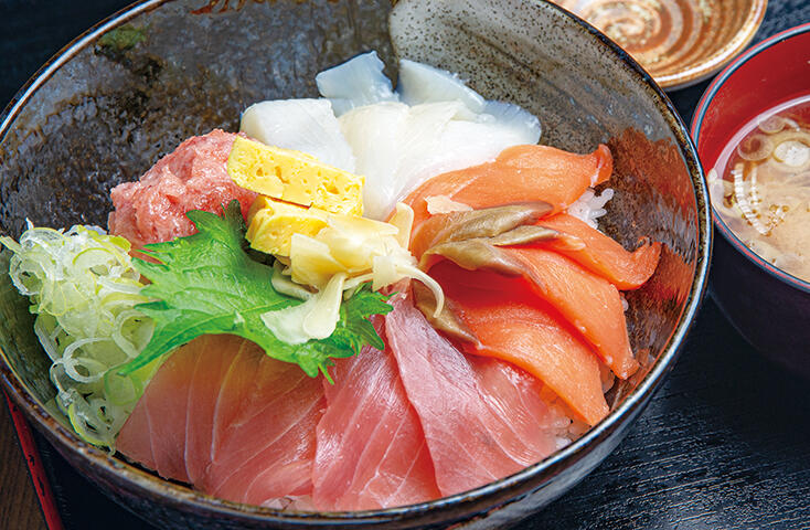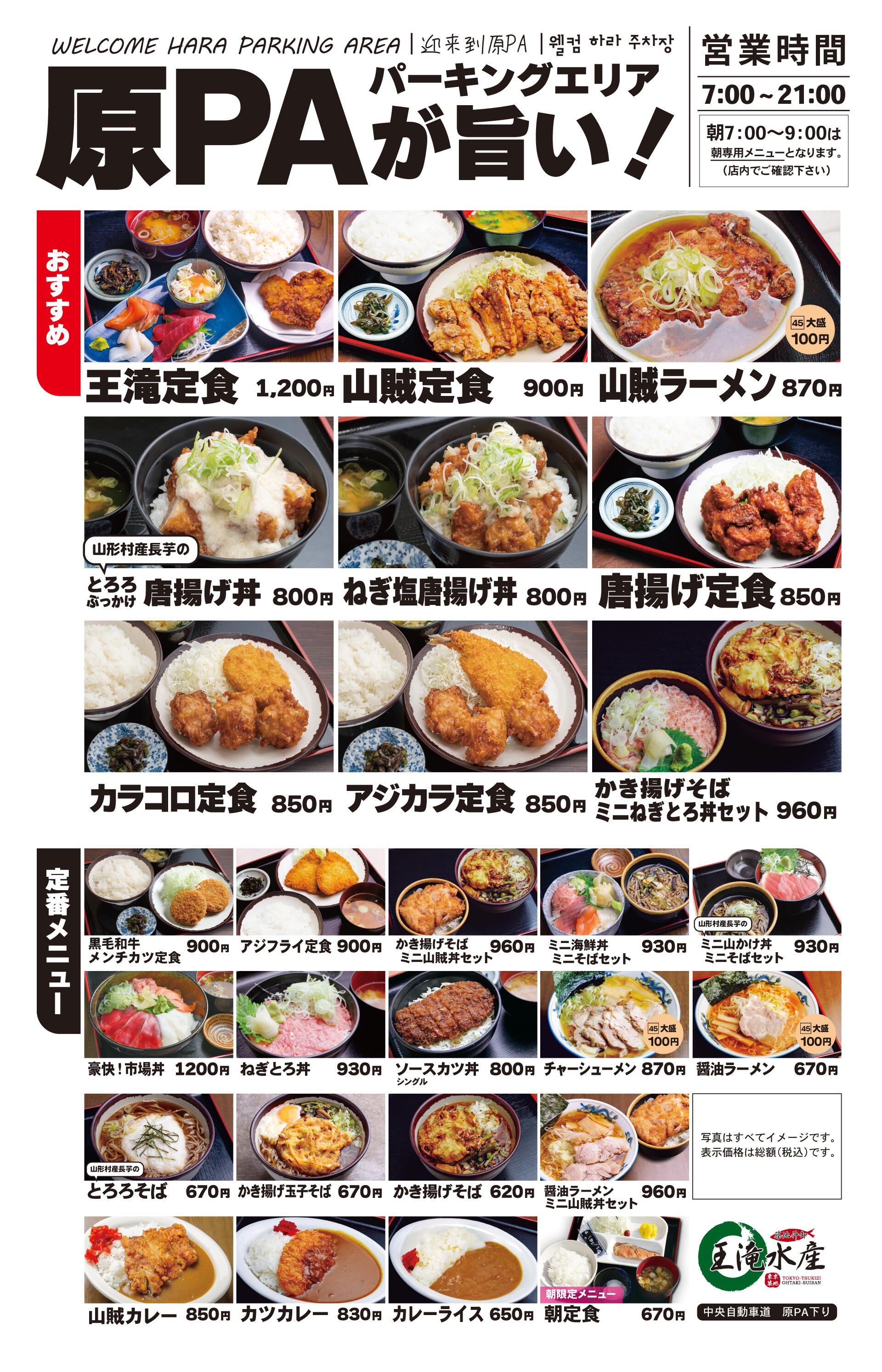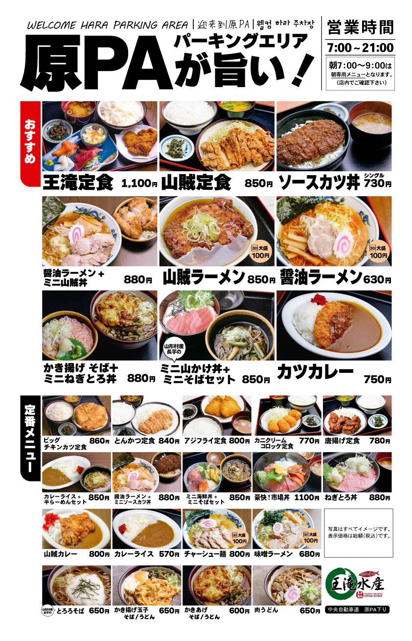 原パーキングエリア下りレストラン「王滝水産」では、豊洲直送の新鮮な魚介類を使った料理を提供しております。 仲買業者の当店だから出来るメニューには、海鮮丼、お刺身の入った定食などご用意しております。その他ソースカツ丼、山賊定食など信州らしいがっつりメニューもございます。是非一度お立ち寄りください。