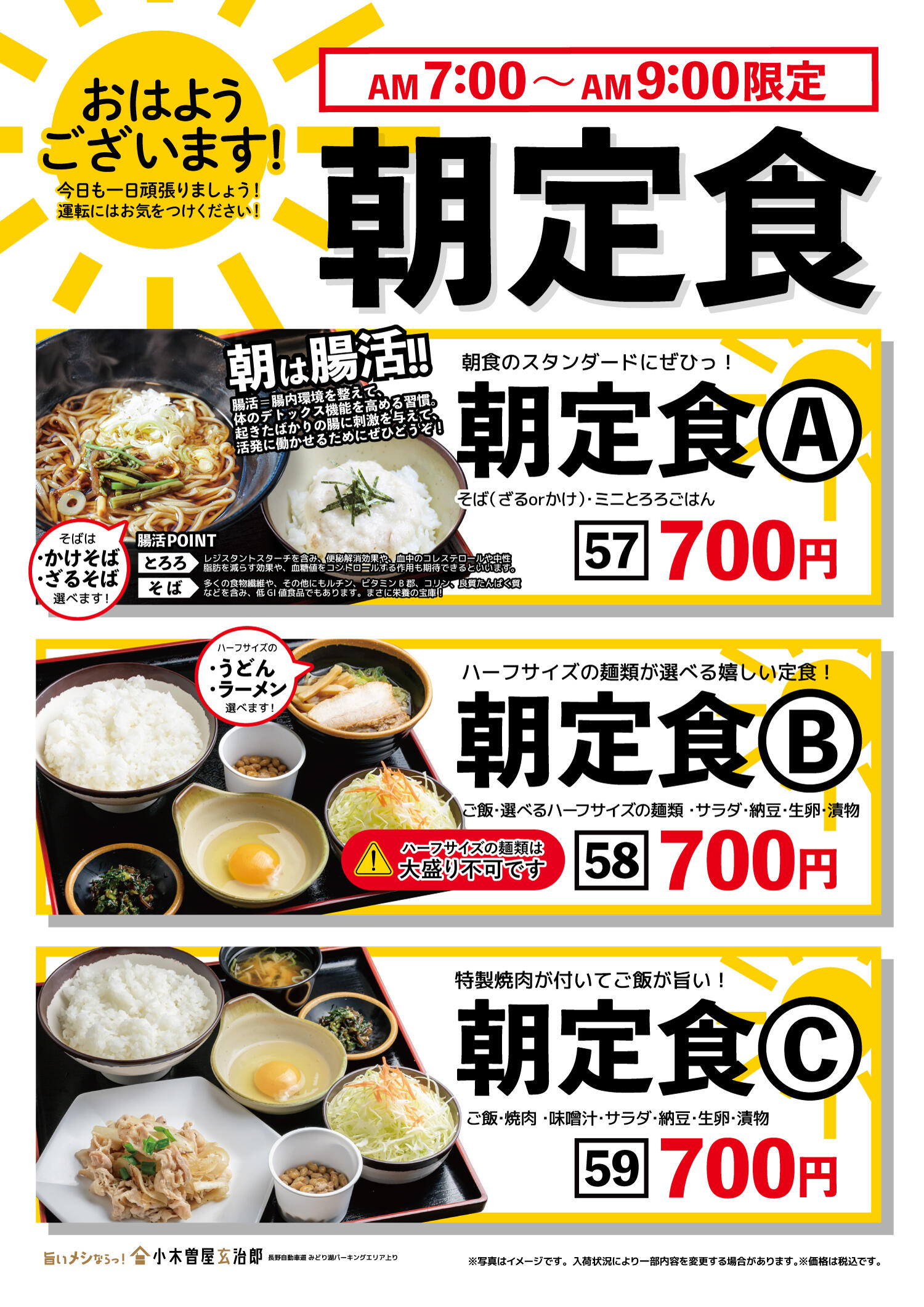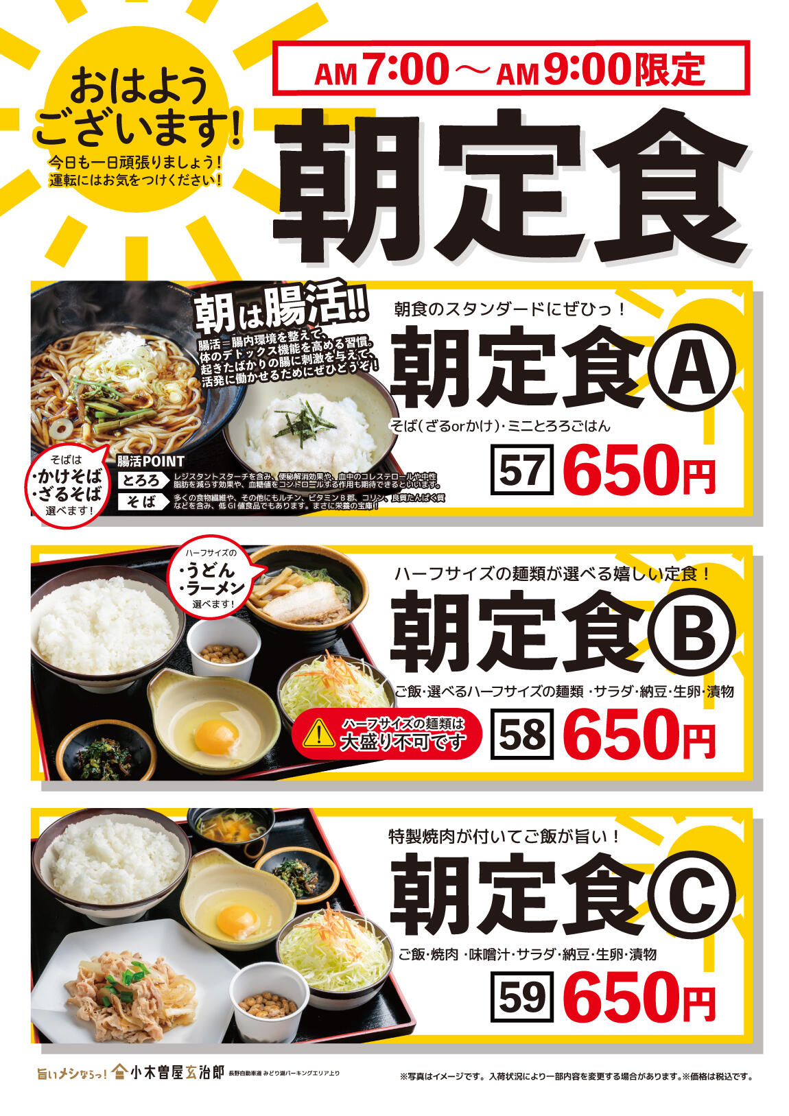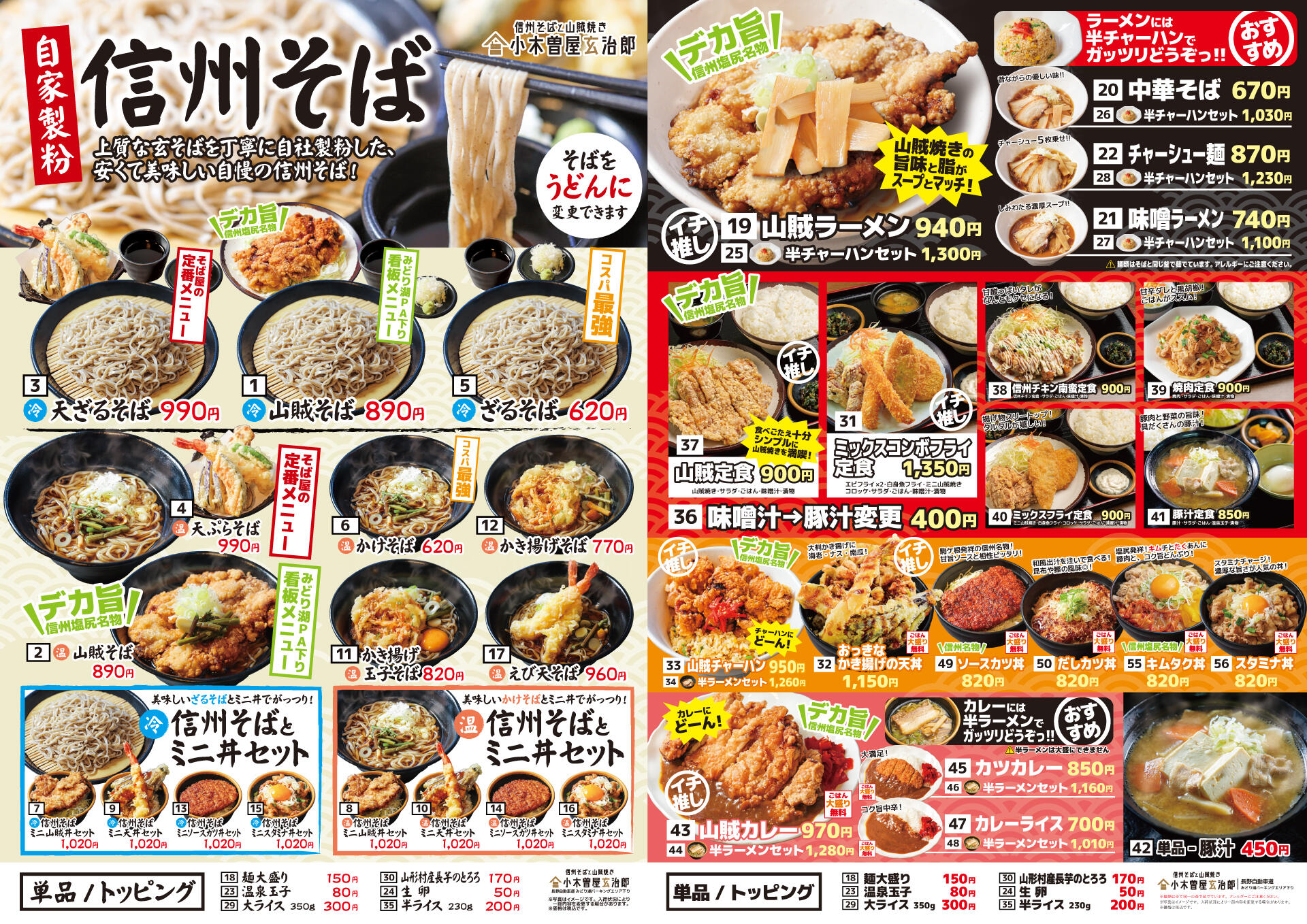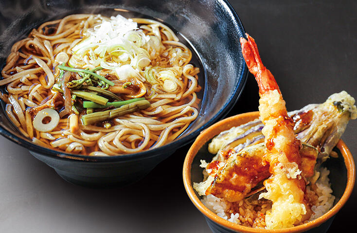 小木曽屋玄治郎では、自社製粉のそば粉を使用した「二八そば」と地元名物「山賊焼き」が召し上がれます。その他、丼物も充実。物販エリアでは、創業明治23年の老舗「お弁当のカワカミ」の駅弁を販売。安曇野で人気の菓子工房「彩香」は、バームクーヘンや詰め合わせ菓子が人気。お昼に、お土産に満足のパーキングエリアです。