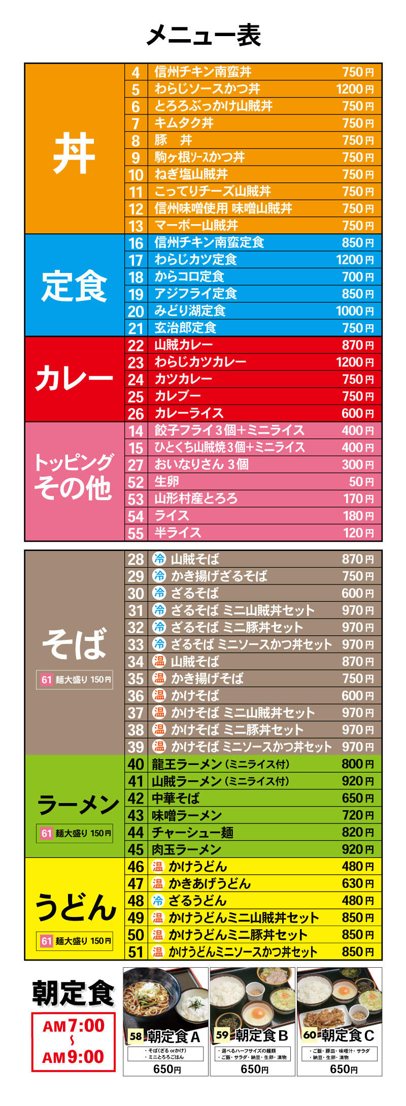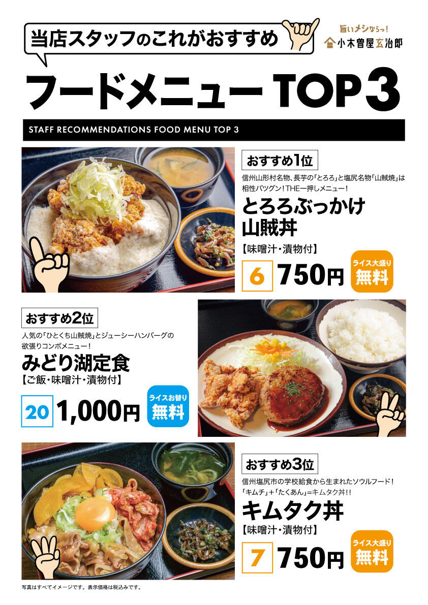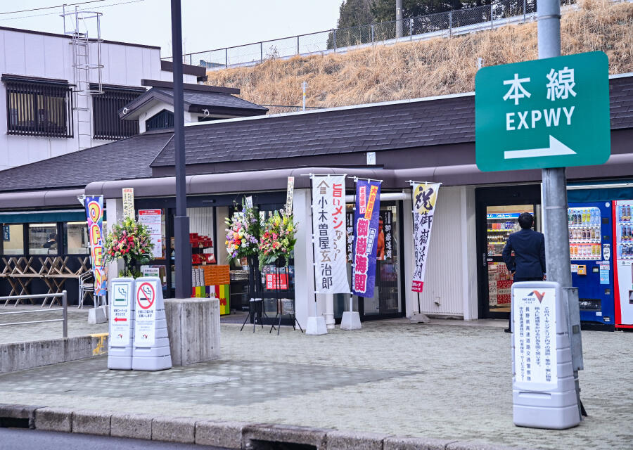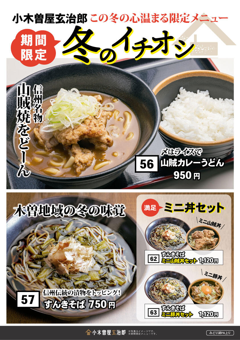 小木曽屋玄治郎では、自社製粉のそば粉を使用した本格的「二八そば」や「わらじかつ」などボリュームを重視したメニューを約50種類ご用意。スーベニアでは、松本エリアの老舗菓子店のお土産や果物、農産物なども取り扱っております。