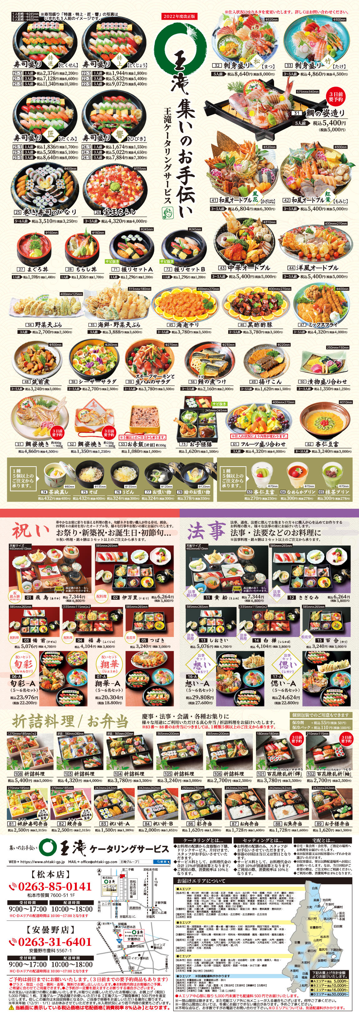 2020年4月1日より、王滝ケータリングサービス 塩尻支店がOPENいたしました。木曽、辰野などへもエリアを拡大し、より多くの皆様に手軽にご注文いただけるようになりました。様々な法事・行事・お祝いの席に、四季折々の素材を活かした寿司・刺身・オードブル等ご利用ください!お料理内容は、ご予算、ご希望に合わせてもご用意できます。