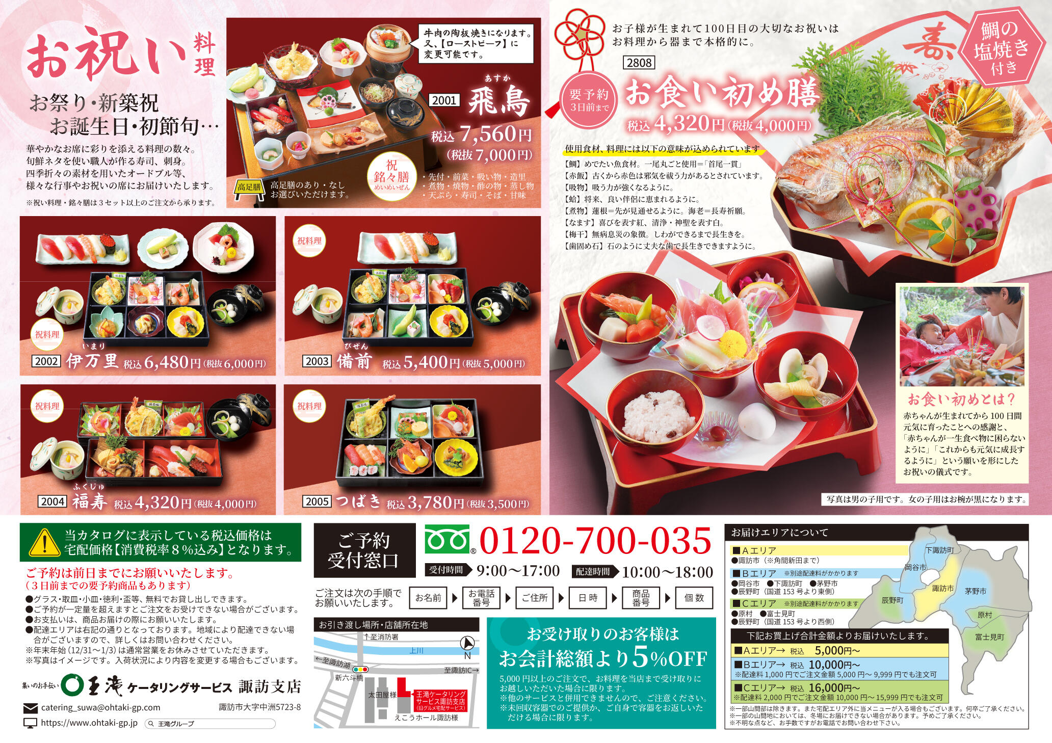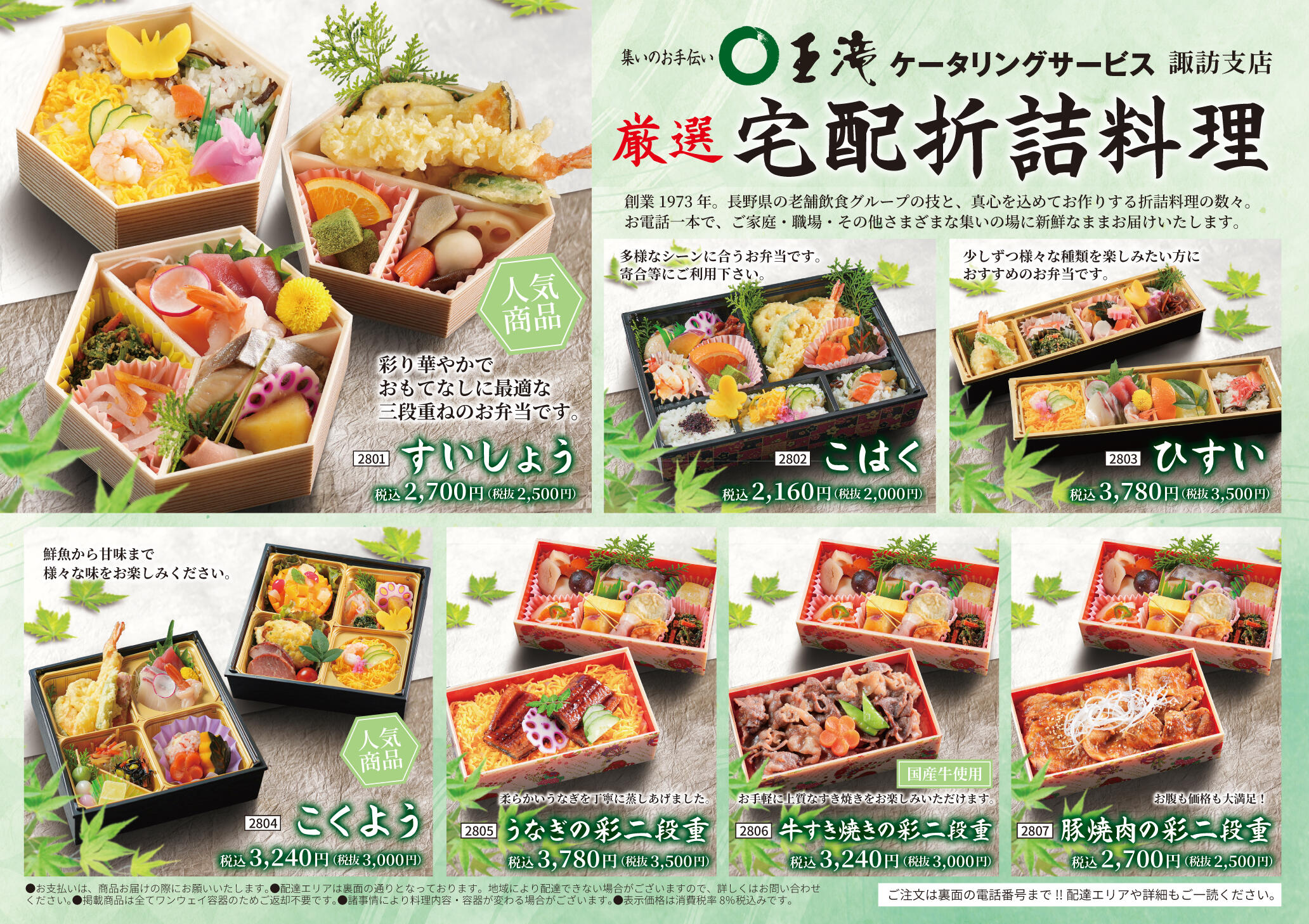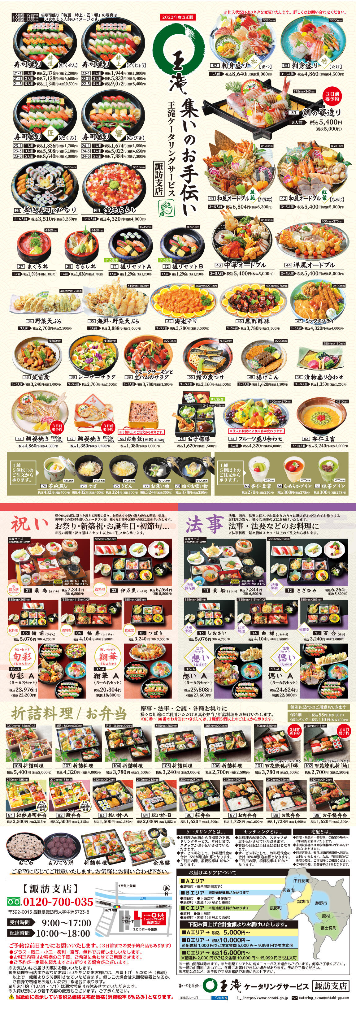 2021年1月16日より、王滝ケータリングサービス 諏訪支店がOPENいたしました。諏訪市、岡谷市、下諏訪町、茅野市、原村、富士見町の皆様にもより手軽にご注文いただけるようになりました。様々な法事・行事・お祝いの席に、四季折々の素材を活かした寿司・刺身・オードブル等をご利用ください!お料理内容は、ご予算、ご希望に合わせてご用意いたします。