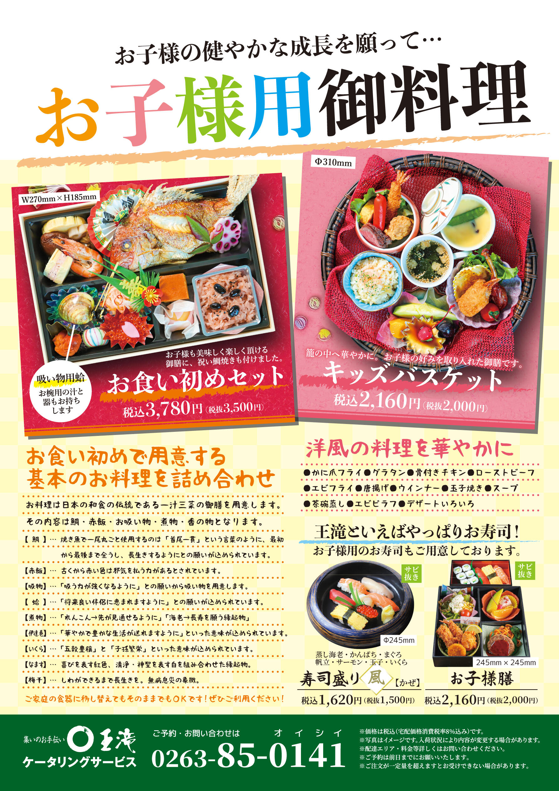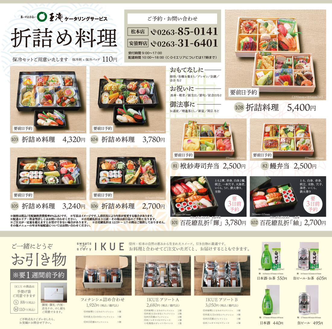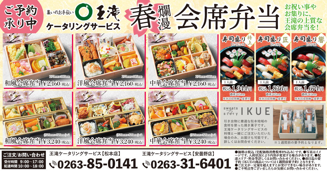 2022年9月1日より、王滝ケータリングサービス 安曇野支店がOPENいたします。安曇野をはじめ、大北・筑北の皆様にもご利用いただけるようエリアを拡大いたしました。施設内は安心安全な衛生管理と現在の倍以上の製造能力を実現し、お客様のご要望にきめ細かく対応いたします。様々な法事・行事・お祝いの席に、四季折々の素材を活かした寿司・刺身・オードブル等ご利用ください!お料理内容は、ご予算、ご希望に合わせてご用意できます。