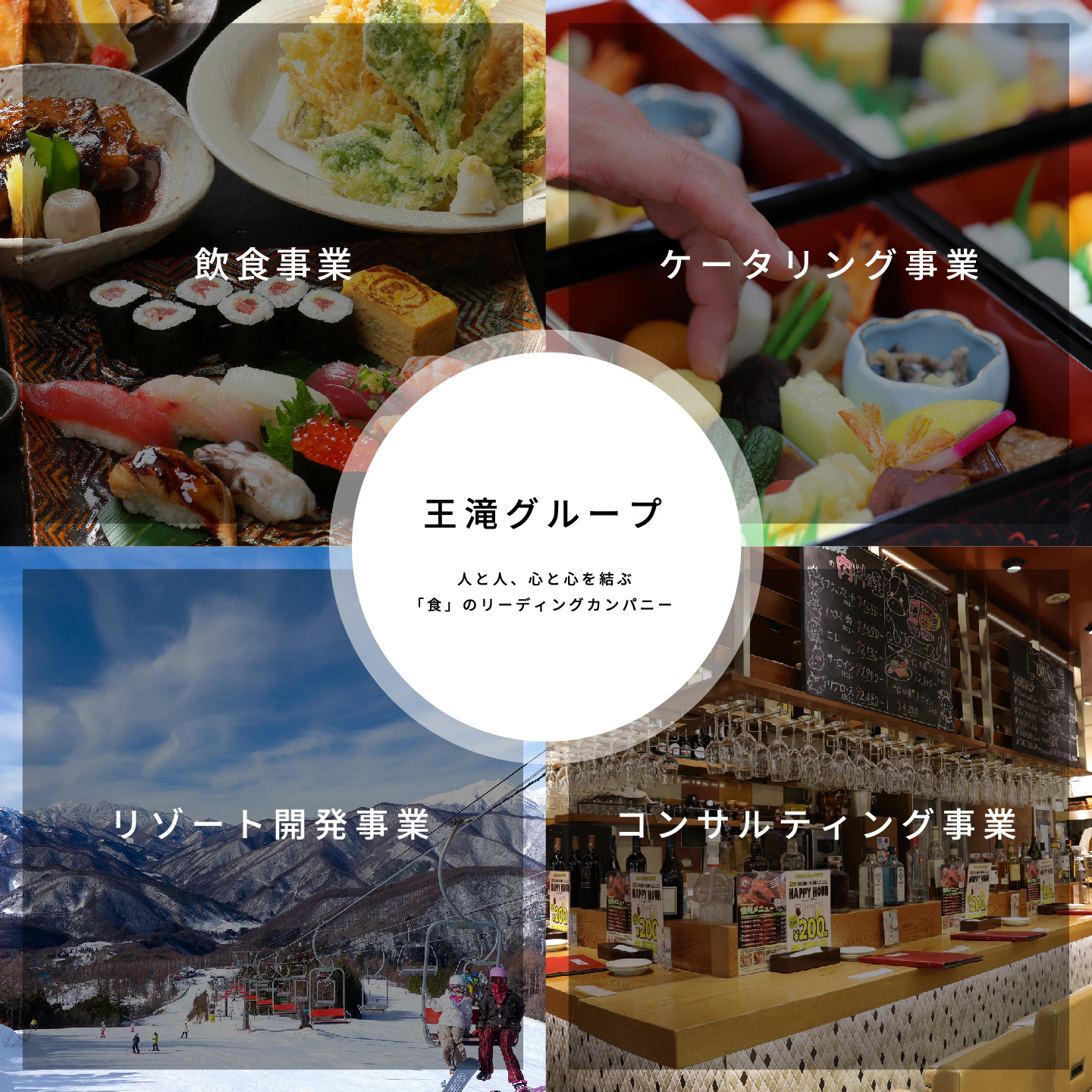 創業から半世紀を前に40店舗以上を展開する王滝グループは、お客様のニーズに応え、時代の流れを読み、常に進化、発展に挑戦してきました。そこで、これまで地域の食産業をリードしてきた実績と、店舗経営のノウハウを次世代にお伝えするコンサルティング事業も展開。今後はみなさまとともに食文化の向上と地域社会の発展に寄与してまいります。