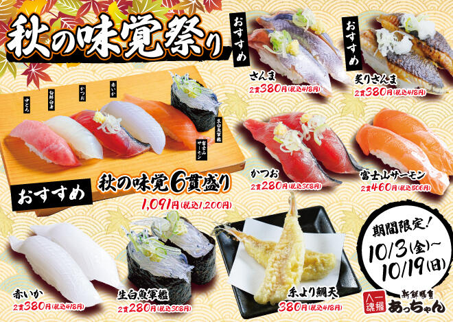 食欲の秋到来!! あっちゃん2店舗では、 10/3(金)~10/19(日)まで「秋の味覚祭り」を期間限定で開催いたします。 今だけの、あっちゃん自慢の6貫盛りや、いろいろな期間限定のお寿司がズラリ。 ぜひ、あっちゃんで美味しいひと時をお過ごしください! ご来店お待ちしております。
