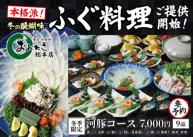 おおたき総本店では、 冬季限定(11月から2月目安)「ふぐ料理」を要予約でご提供いたします。 ふぐ料理がズラリと集まった「河豚コース」は9品でおひとり様7,000円 職人が真心を込めてお作りいたします! ぜひ、この機会に上質なふぐ料理を食べにご来店ください! スタッフ一同、心よりお待ちしております。...