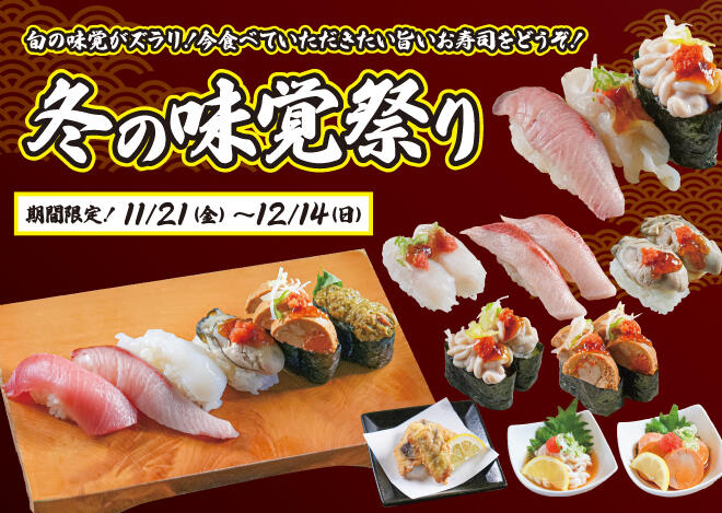 食欲の秋到来!! あっちゃん2店舗では、 11/21(金)~12/14(日)まで「冬の味覚祭り」を期間限定で開催いたします。 今だけの、あっちゃん自慢の6貫盛りや、いろいろな期間限定のお寿司がズラリ。 ぜひ、あっちゃんで美味しいひと時をお過ごしください! ご来店お待ちしております。