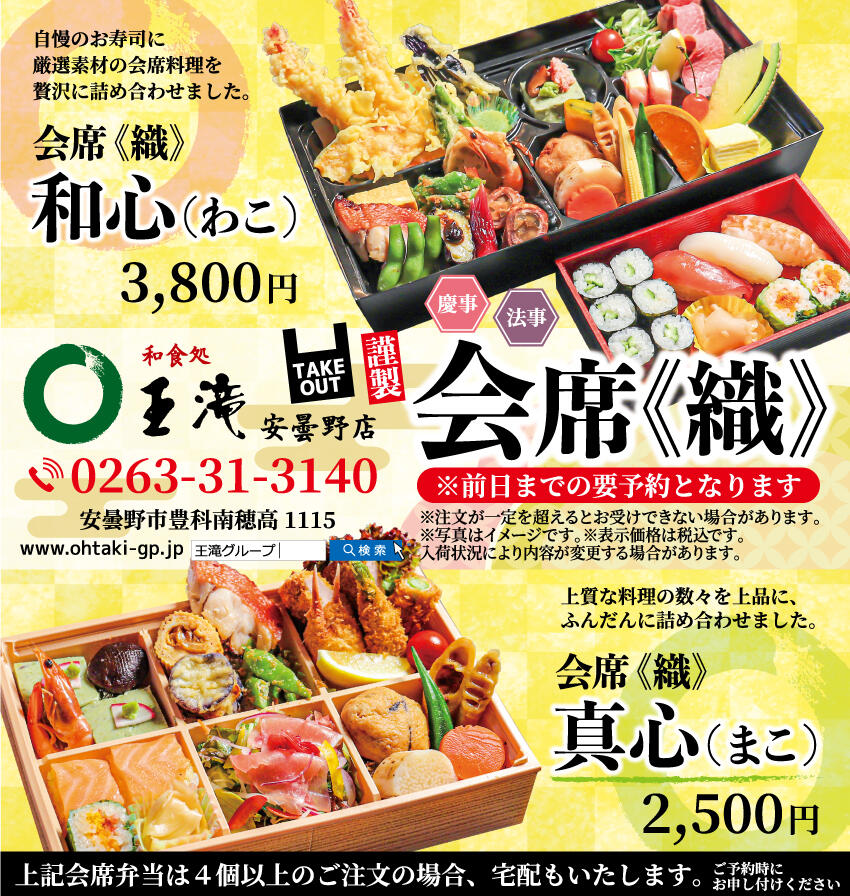 【王滝安曇野店】お店の上質をご家庭で!会席織承ります!
