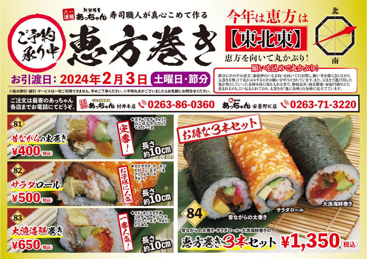 あっちゃん村井本店・安曇野インター店では、寿司職人が真心込めてお作りする「恵方巻き」のご予約を承っております。※2/3(土)節分のテイクアウトのみとなります。