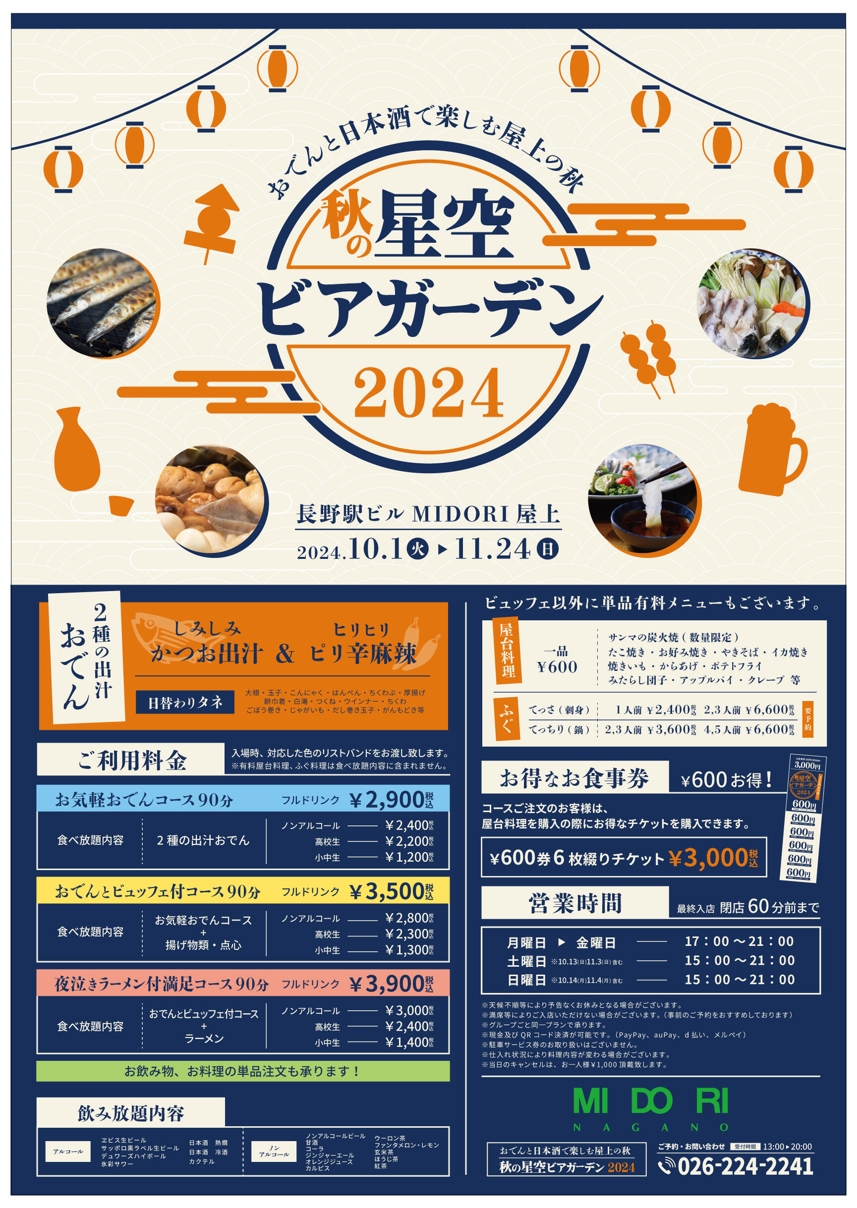 例年、8月で終了いたします星空ビアガーデンですが、今年は「秋の星空ビアガーデン」として10月1日(火)より再開いたします。