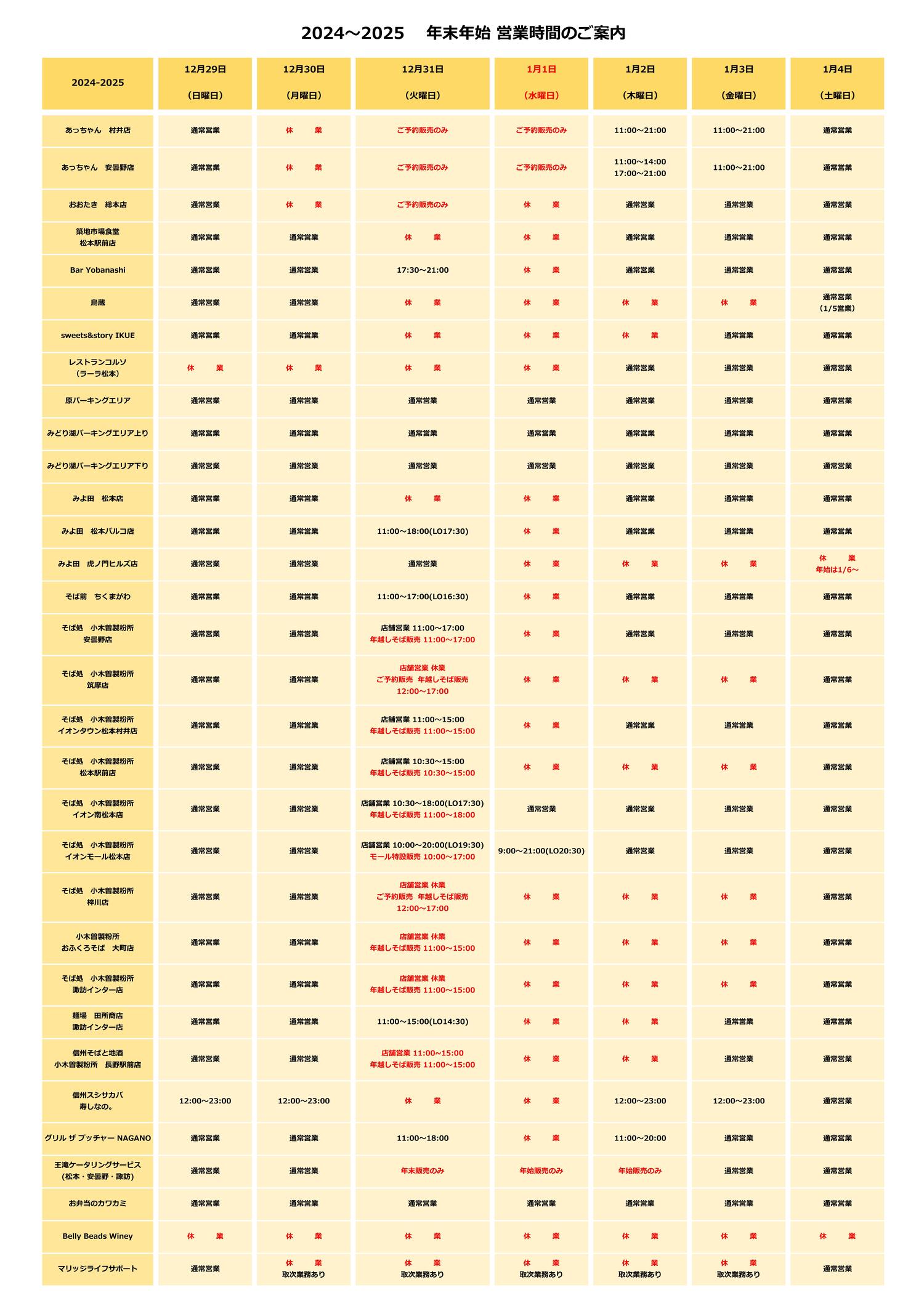 平素は格別のお引き立てを賜り、厚く御礼申し上げます。王滝グループでは、年末年始の営業時間を下記の通りとさせていただきます。皆様には大変ご不便をおかけいたしますが、ご理解賜りますようお願い申し上げます。