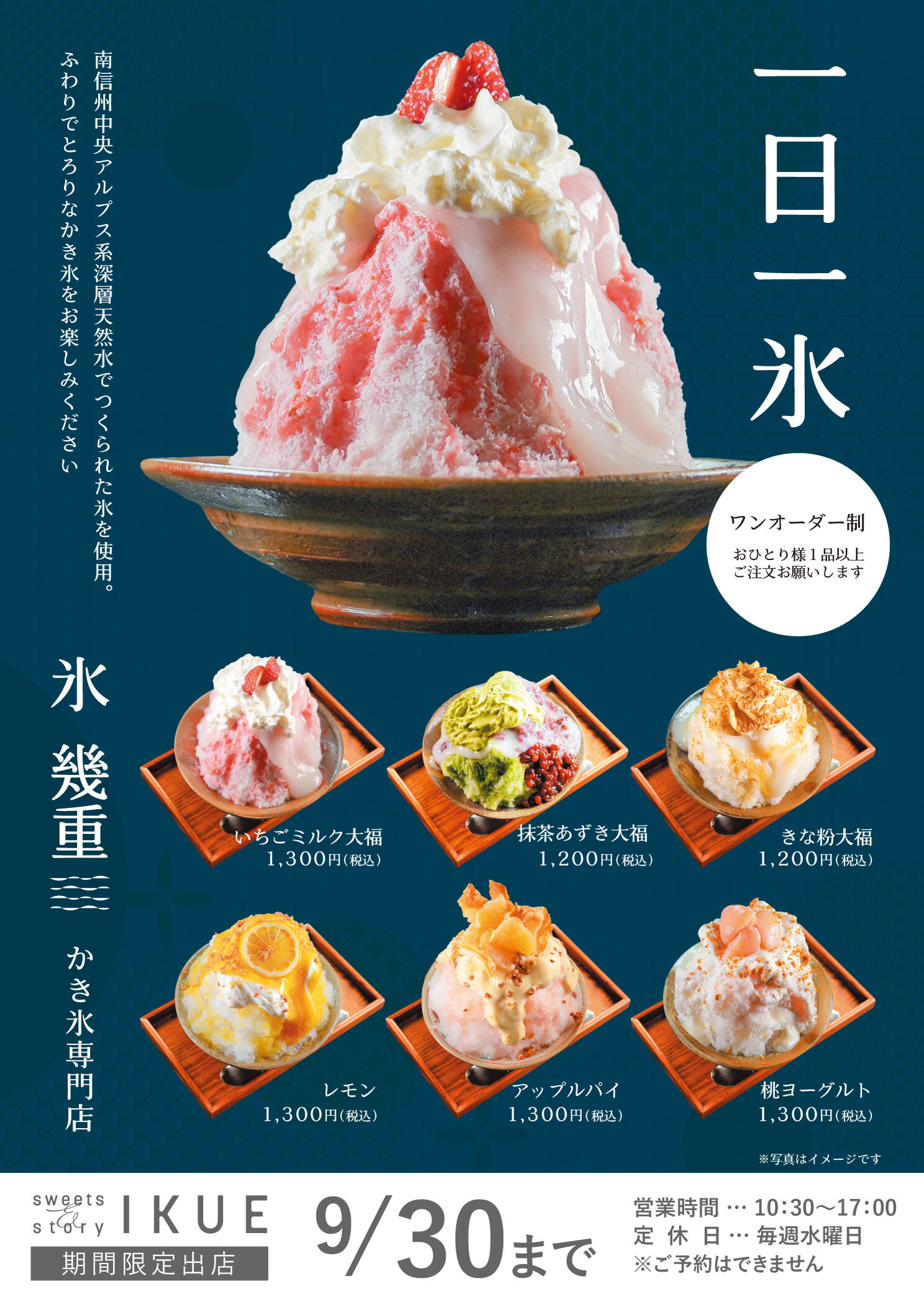 「sweets&story IKUE」では、「氷 幾重」として7月31日よりかき氷専門店を始めます。