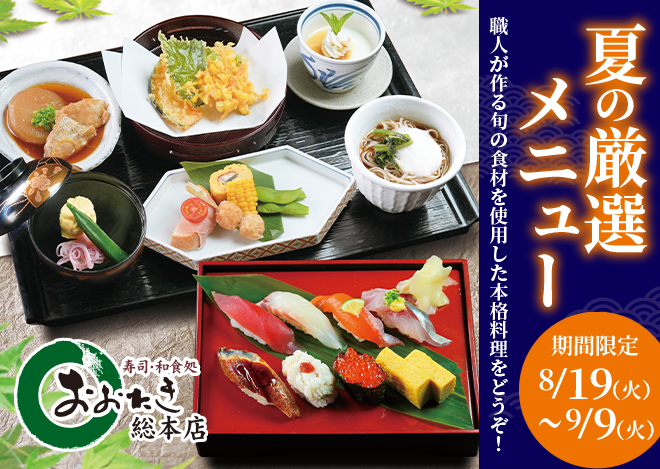 おおたき総本店では、 8/19(火)~9/9(火)まで「夏の厳選メニュー」と題して、期間限定のメニューをご提供しております。 この季節ならではの、旬鮮食材を使用したお料理は以下の通り。 ●夏の寿司御膳 3,680円 ●にしん蕎麦セット 1,850円 ●大海老天重 1,950円 職人が真心を込めてお作...