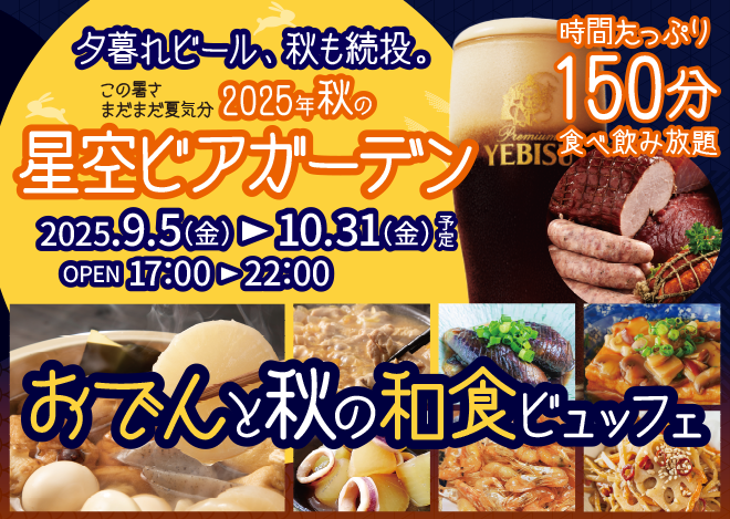 いつも「星空ビアガーデン」をご愛顧いただき、誠にありがとうございます。 夏営業のご好評を受け、9月5日(金)より「秋のビアガーデン」を開催いたします! メニューは「おでん」「焼き鳥」「なす揚げ浸し」など、秋の夜にぴったりの和食ビュッフェに一新。信州産の食材も取り入れた、心も体も温まるラインナップをご...