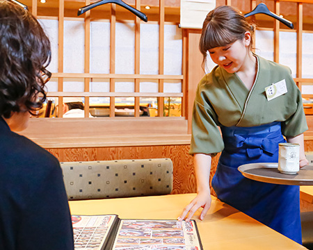 お客様をご案内し、おしぼりとお茶を出し、オーダー、配膳、下膳などをします。宴会の場合は飲み物のオーダーなどもとります。14:30のラストオーダーまで忙しく動くので、結構あっという間です。
