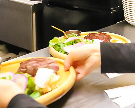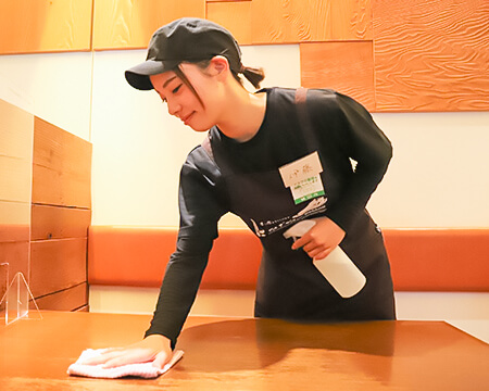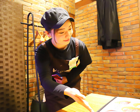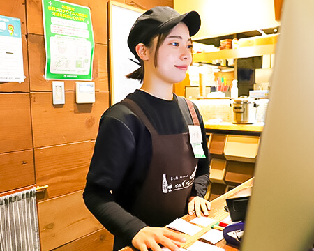 お客様のオーダーを聞いて、料理の提供、ドリンク作り、食事後の片付けなどのホール業務全般を担当。洗い場での作業も行います。